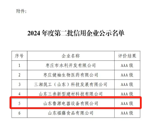 8月6日,《棗莊之窗》從棗莊市企業(yè)聯(lián)合會(huì)發(fā)布“關(guān)于公布2024年度第二批信用企業(yè)名單的通知”獲悉,山東魯源電器設(shè)備有限公司等6家企業(yè)獲得AAA級(jí)信用等級(jí)評(píng)價(jià),并予以公布。